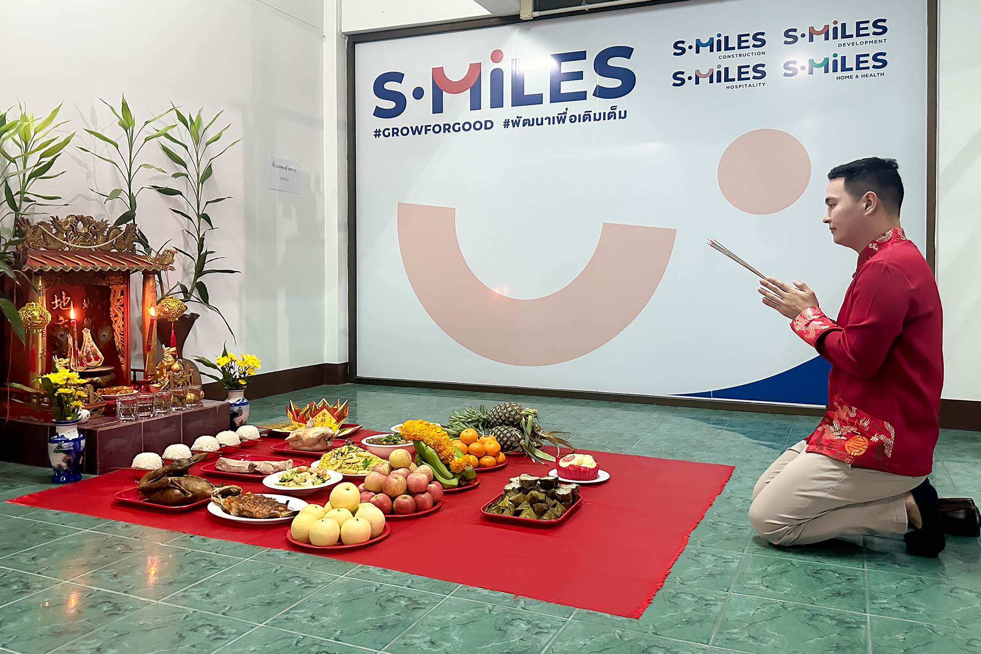 พิธีไหว้เจ้าตรุษจีน - ไป๊เหล่าเอี๊ย จากทีมคณะผู้บริหารนำโดย คุณธง เมธากุล สุวรรณบุตร ที่จัดเต็มด้วยเครื่องไหว้ : โหงวแซ (เนื้อสัตว์ 5 อย่าง) ร่วมกับเหล้า,น้ำชา, น้ำ, ของหวาน, ผลไม้ และกระดาษเงินกระดาษทอง เพื่อขอพรให้กับครอบครัว เอส ไมล์ กรุ๊ป โชคดี เฮง ๆ ปัง ๆ ตลอดปี